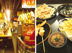 焼鳥2本、手羽先1本、芋フライ、いかの塩辛+お好み焼きor焼きおにぎり茶漬け